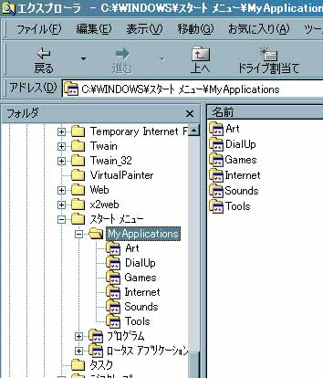 | さて、たまには「どんな風に使っている」とか、「こうすると便利」とかをやってみたいと思います。 私の部屋は異常に散らかっていますが、ディスクトップはすこぶる奇麗です(笑)。アイコンは10コ歩かないかです。たとえばノートではこんなふうです。あまりあると探しきれなくなる(部屋の中といっしょだな・・・)のと壁紙を設定していた場合無意味になりそうになるのが嫌なんですね。あと、アプリケーションが覆ってしまっている場合呼び出すのが大変!それが主な理由でしょうか。その代わりたしょういじっているのがスタートメニュー。プログラムのところは何も手をつけずに、というかソフトが大量に入ると手がつけられないので諦め(やっぱり部屋の中といっしょ)です。具体的にはスタートメニューにに一つ MyApplications というフォルダーを追加し、その中にジャンル・用途別サブフォルダーを作ります。たとえば Games, Art, Internetといったように。ポイントは必ずアルファベットで、且つ重ならないように。本当ならば Graphics と行きたいのですがあえて Art です。理由はキー操作でたどりつきやすいのです。もし MyApplication > Internet > NextFtp と登録しておいた場合、 WINDOWキー > M key > I Key > N と打ち込めばめでたく NextFtp に行けます。ショートカットキーという手もありますがそこまでは気が向かないやつにお薦めです。ここに必要なやつをジャンルでかぶったとしてもメニュー化しておくと結構便利です、自分的長年の経験ではいかがでしょうかねぇ? 作り方の一例(操作など) |